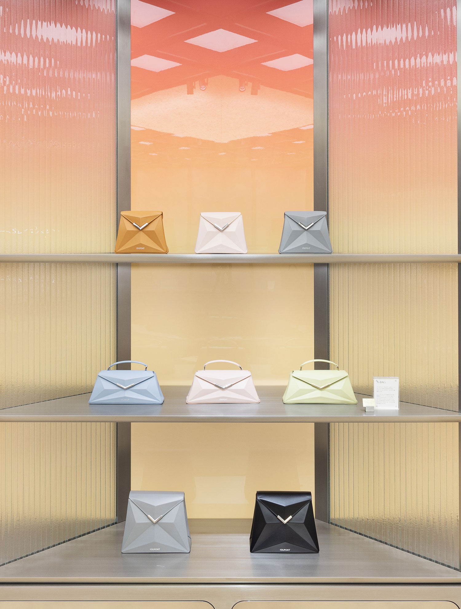 From the entrance — framed by fluted pillars echoing the form of a lighter — the experience begins. Mirrored floors and ceilings guide visitors through a sensory journey, from the supple leather of fine accessories to the precision and presence of lighters and writing instruments.At the heart of this refined scenography hangs a striking chandelier in the shape of an inverted pyramid, suspended from a steel grid ceiling. Adorned with traditional washi paper, it weaves a delicate connection between Japanese craftsmanship and French heritage.