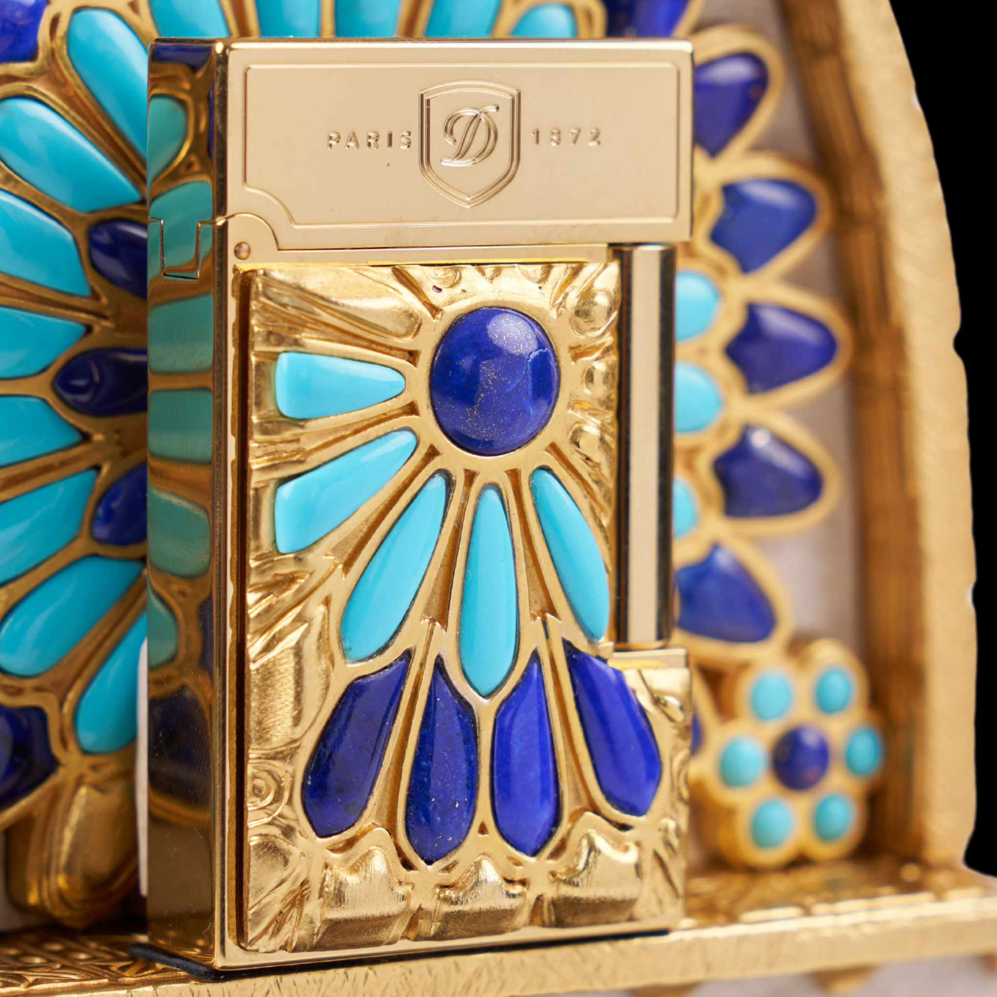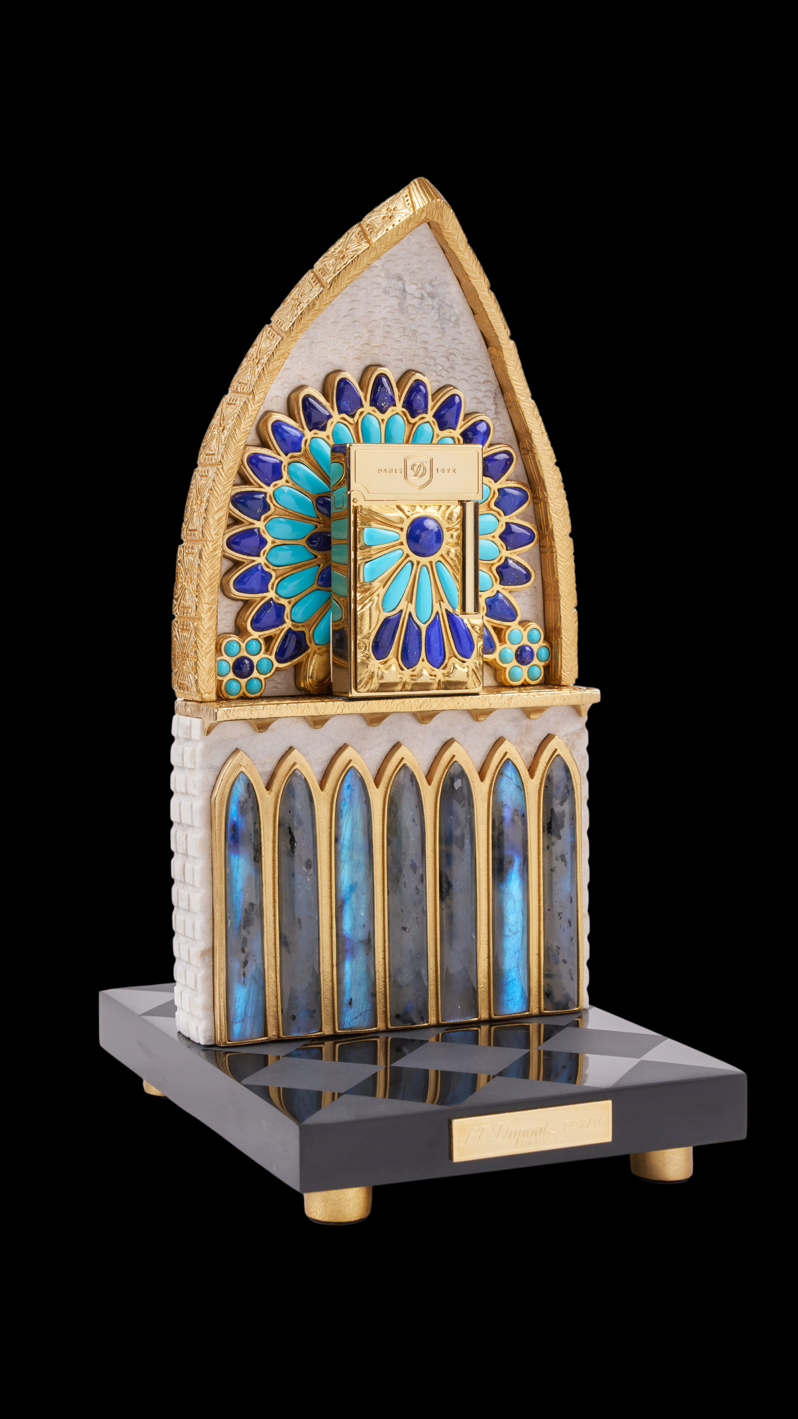 The Ligne 2 lighter is set on a vermeil base, resembling an altar, and echoes the stained glass of the cathedral’s rose window in the bright, enchanting colours of blue and turquoise.
