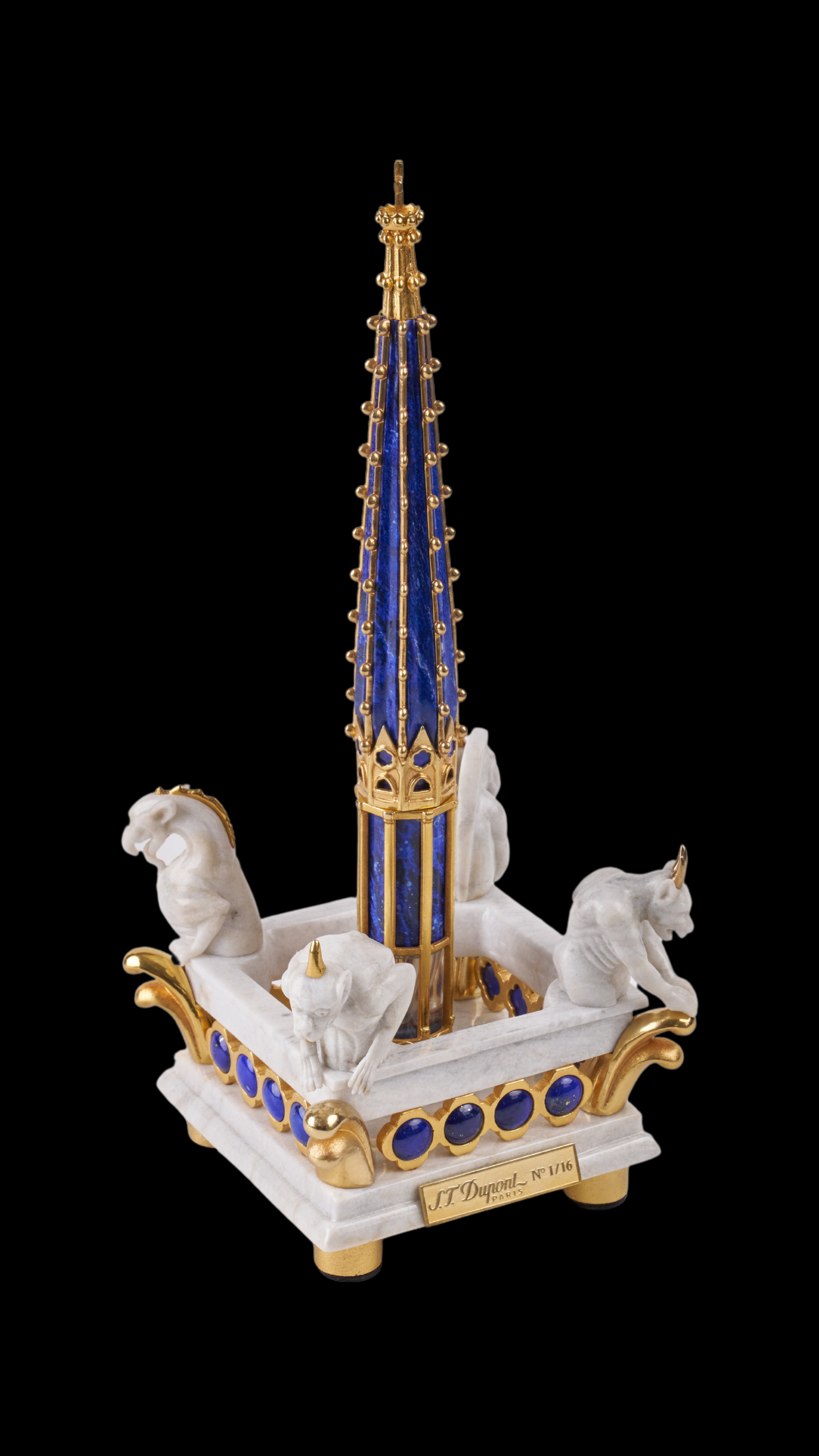 A stylized reproduction of the spire of Notre-Dame, with a slender structure in blue lapis lazuli, white calcite, and vermeil, recalling the Gothic elegance of the cathedral’s architecture.