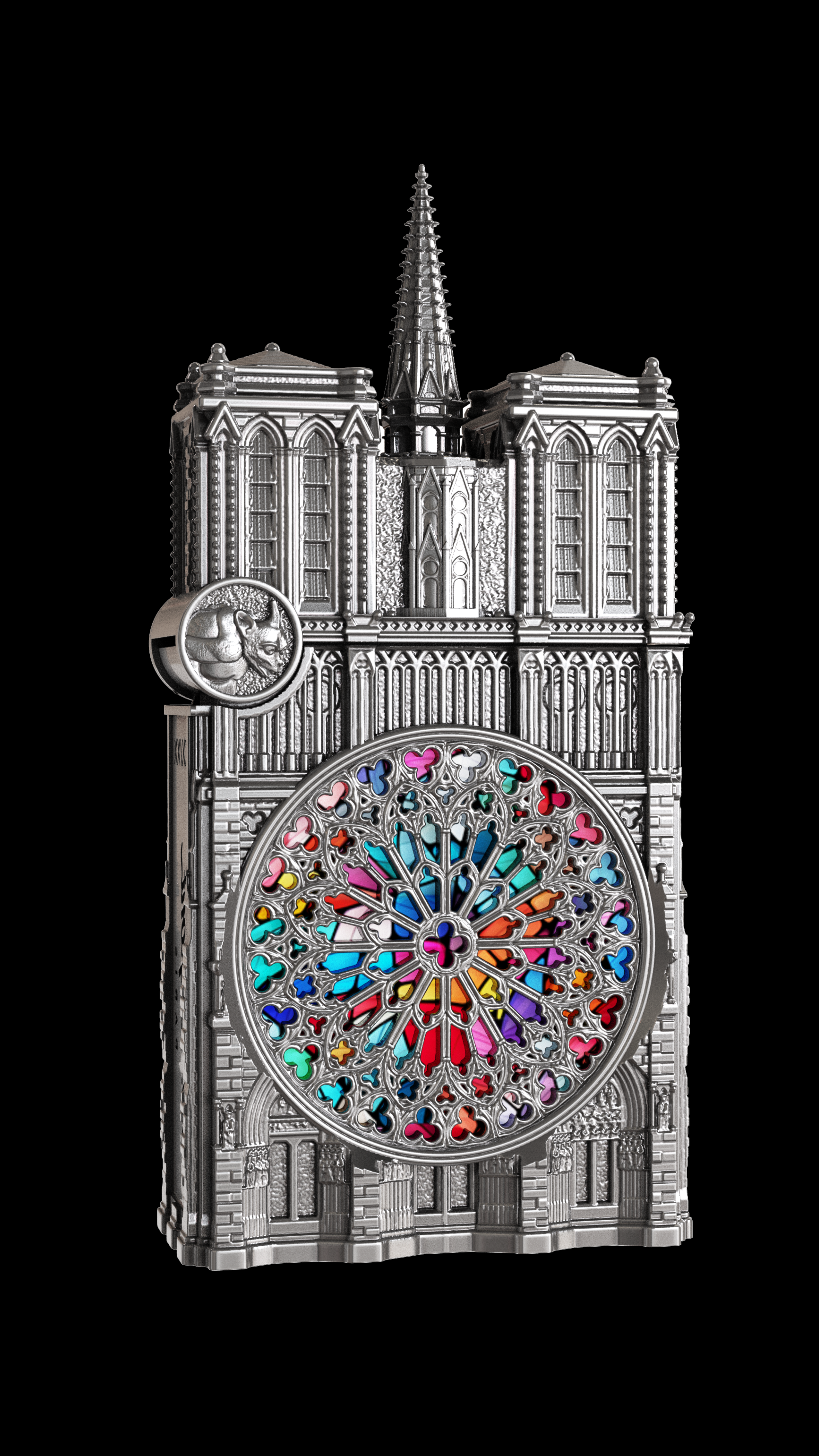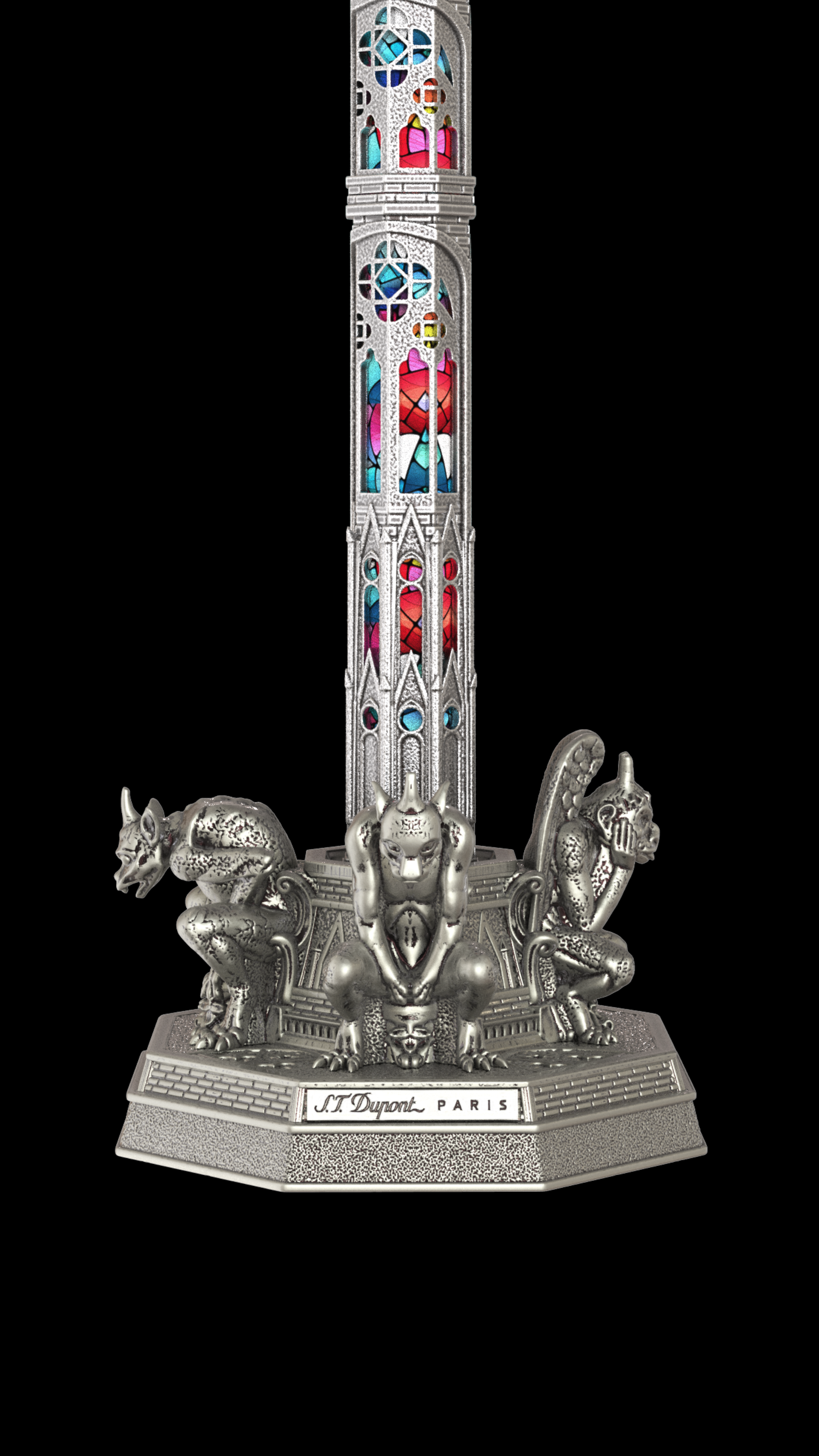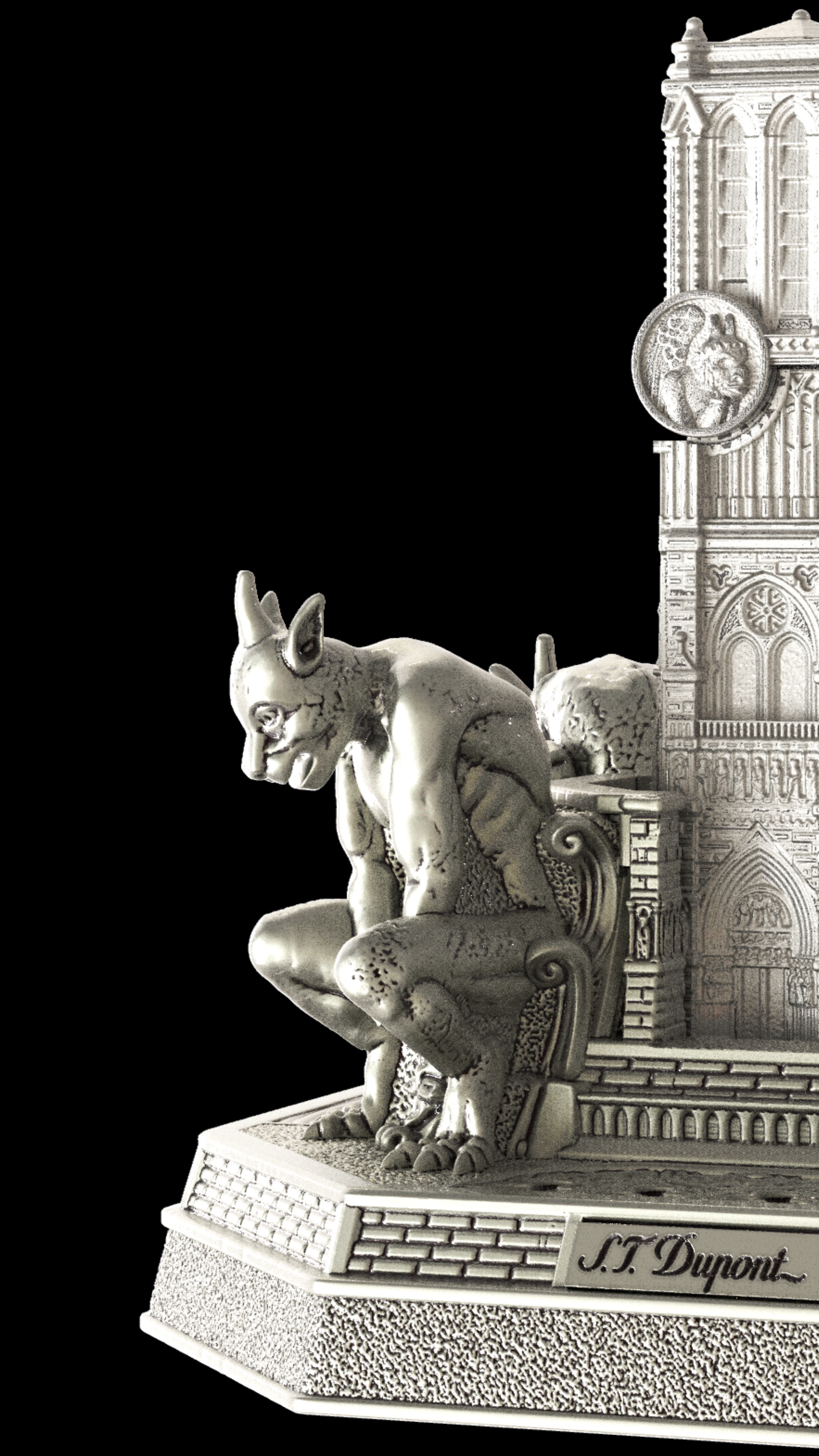 Both the goldsmith lighter and the writing instrument bases feature four gargoyles, often interpreted as the cathedral’s protective guardians. Their main role is to channel rainwater from the roofs away from the walls to prevent erosion and damage to the structure.