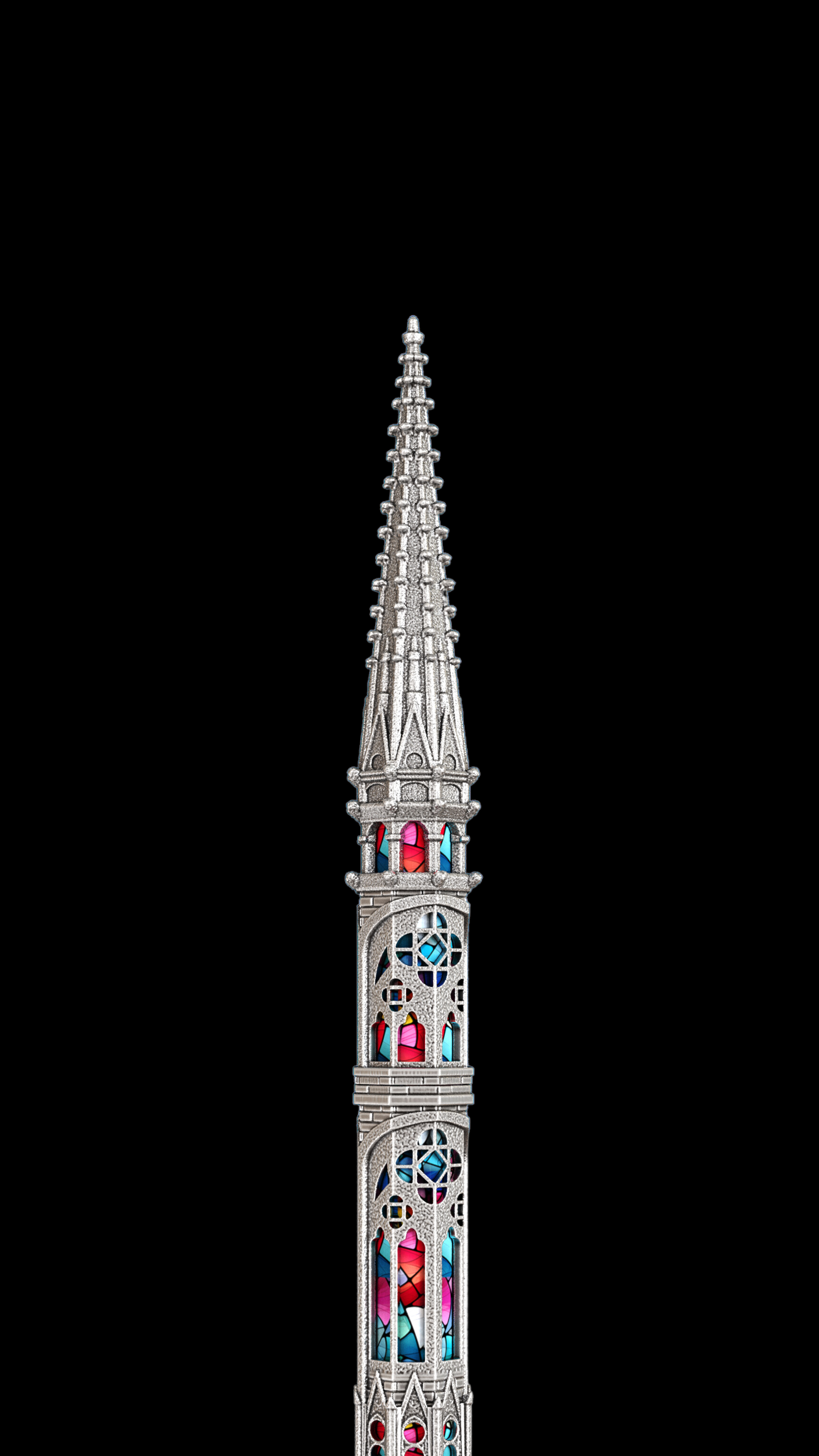 Then, a new goldsmith masterpiece: another writing instrument in the shape of the cathedral’s spire achieves a rare level of detail. A fine blend of coloured stained glass and silver, this piece combines grandeur and precision, making the writing instrument a tribute to the architecture and spirituality of Notre-Dame.