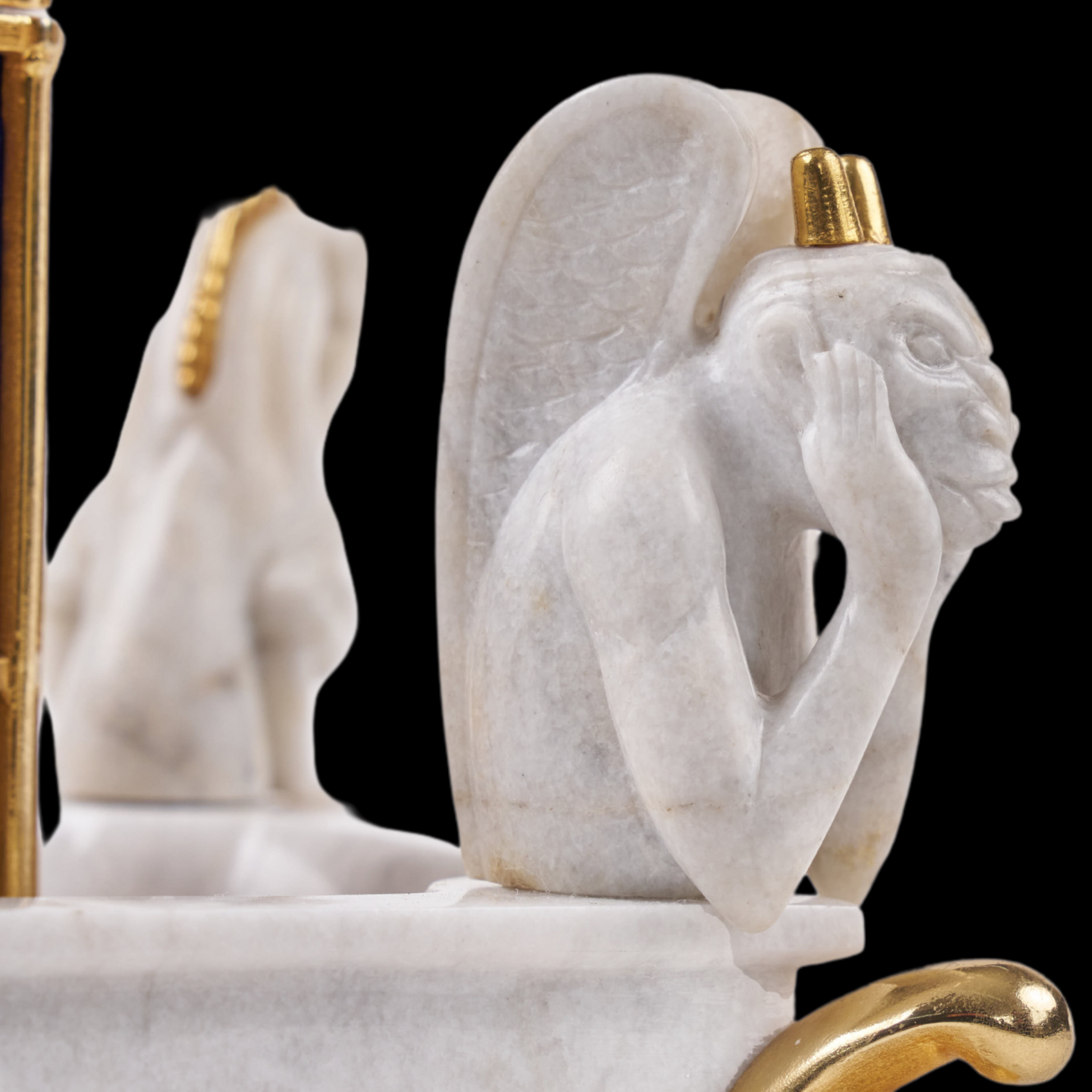 The base features motifs that mimic cathedral floor tiles, giving the piece exceptional depth and visual richness. On the back, a gargoyle emerges from the grey-white calcite, adding a dimension of stone sculpture to S.T. Dupont craftsmanship.